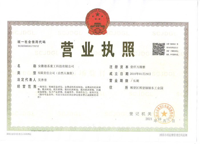 安徽德系重工科技有限公司成立于2010年,擁有《市級企業(yè)技術中心》、《馬鞍山科學技術局彎曲工程技術研究中心》兩個研發(fā)中心,連續(xù)九年被評為《國家高新技術企業(yè)》,更是業(yè)內唯一獲得《武器裝備科研生產單位三級保密資格證書》和《武器裝備質量管理體系認證》的企業(yè)。 公司產品擁有九項發(fā)明專利和十五項實用新型專利,榮獲《安徽工業(yè)精品》《安徽省新產品證書》《安徽省名牌》《安徽省著名商標》并通過歐盟CE認證和德國萊茵認證,產品暢銷海內外。