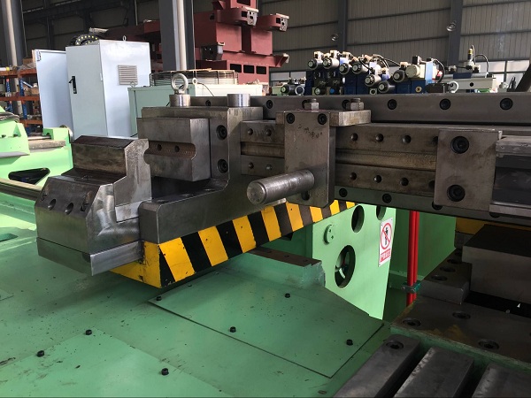八、輔推油缸安裝在輔推架內(nèi)(頂鐓模塊的頂鐓油缸和頂鐓架為整體鍛造40Cr并調(diào)質(zhì)),輔推(頂鐓)油缸同等行程下有效減少輔推(頂鐓)機(jī)構(gòu)長度,避免了彎曲管件尾部因輔推(頂鐓)機(jī)構(gòu)長度帶來的直線段浪費(fèi)。(注:頂鐓功能模塊為特殊附件,需另訂)九、抓料、轉(zhuǎn)角、送料小車安裝在獨(dú)創(chuàng)的三道軌床身上(數(shù)控型,NC型無此項(xiàng)):