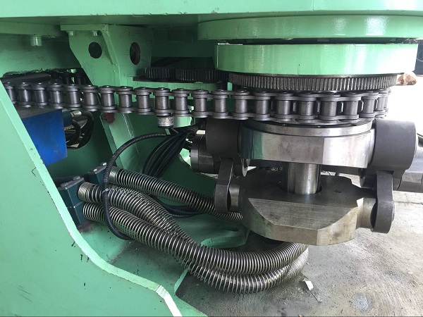 四、傳動主軸系由兩個德國FAG調(diào)心滾子軸承直接從機(jī)頭上部熱裝插入,裝配精度極高,彎管時主軸可同時承受巨大的徑向和軸向聯(lián)合負(fù)載,徑向、軸向近乎零跳動,精度保持性好,拆卸維護(hù)也方便快捷。與主模復(fù)位和張合脫模功能模塊構(gòu)成精巧耐用的三層軸系結(jié)構(gòu)(發(fā)明專利)。