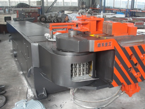 ● 傳動主軸裝配時直接從機(jī)頭上部插入,安裝精準(zhǔn),維護(hù)方便。彎管主軸與傳動鏈輪整體鑄造,整體加工,整體滾齒,無鍵連接,短節(jié)距滾子鏈傳動,受力均勻。傳動主軸由雙油缸驅(qū)動,彎管3.1轉(zhuǎn)/分,彎管過程中,轉(zhuǎn)臂在接近彎曲設(shè)定的角度值前液壓系統(tǒng)自動節(jié)流緩沖,極大的提高了彎曲精度。返回則達(dá)到4.2轉(zhuǎn)/分,快速復(fù)位,接近始點設(shè)有節(jié)流緩沖,極大的提高了復(fù)位精度和工作效率,同時利用復(fù)位背壓脹緊鏈條無需定時調(diào)節(jié)維護(hù)(是國內(nèi)少有采用該結(jié)構(gòu)的廠家)。