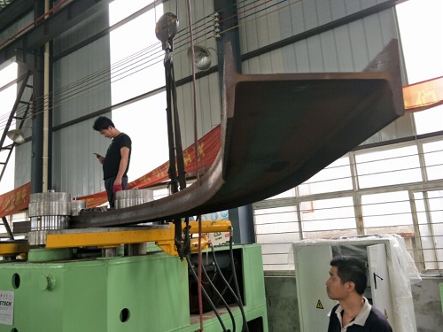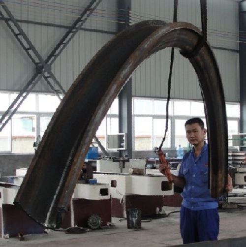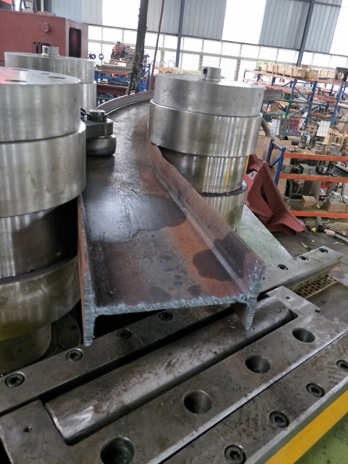 07.回轉電動和液壓位移驅動:一次上料完成,各種型材(角鋼、槽鋼、H型鋼、圓鋼等)端部預彎和回轉彎曲成型,可將各種型材彎曲成所需要的圓形、弧形、螺旋形、橢圓形等預定曲率工件。