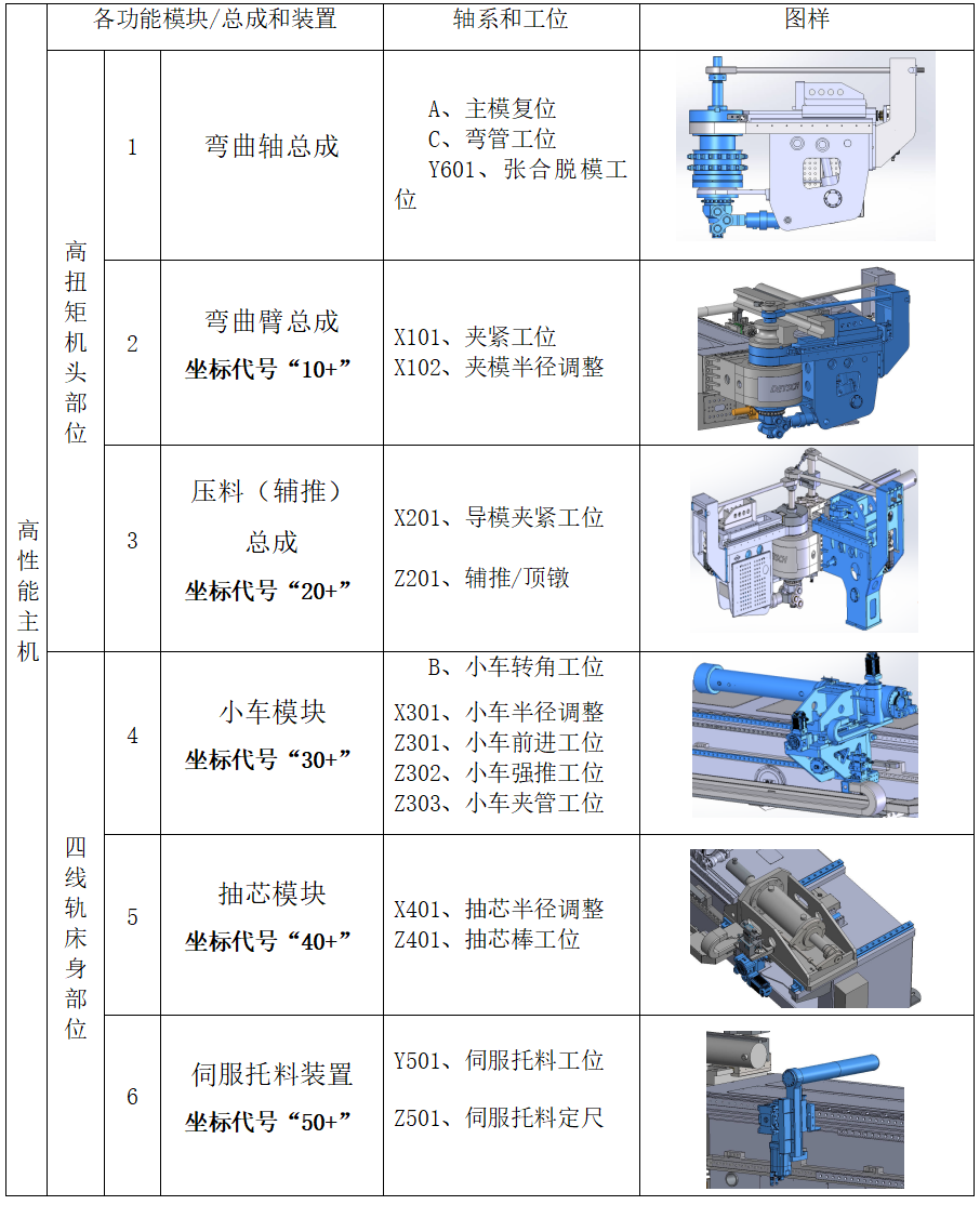 9.1.2.采用無芯彎曲作業(yè)模式時,該工位自動調(diào)整抽芯模塊位移至床身尾部最內(nèi)側(cè)的非作業(yè)安全區(qū)域,主動規(guī)避無芯彎曲長管材出現(xiàn)的碰撞和干涉,無需傳統(tǒng)設備需要人工拆卸該模塊。取消無芯彎曲工藝模式時,該工位自動復位并調(diào)整好作業(yè)半徑,避免拆卸后的再次組裝。