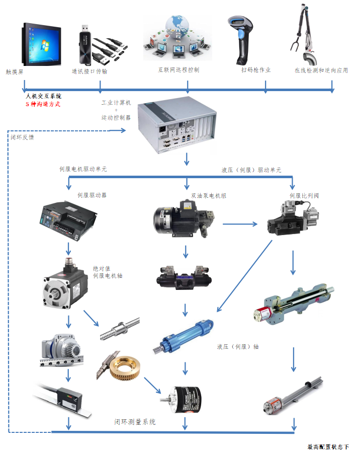 采用基于Windows10 操作系統(tǒng)的德國原裝進口工業(yè)計算機為上位機,通過多軸運動控制器對整機各功能模塊、總成的軸系或工位實施極致性能的精確控制。該智能系統(tǒng)由人機交互系統(tǒng)(HMI)移動式操作界面(有啟動及急停按鈕),19寸投射式電容多點觸摸、LCD彩色觸摸屏、工業(yè)電腦(PC)和可編程多軸運動控制器(Motion controller PLC)、絕對值伺服驅(qū)動單元(servo)及電器柜五部分組成。
