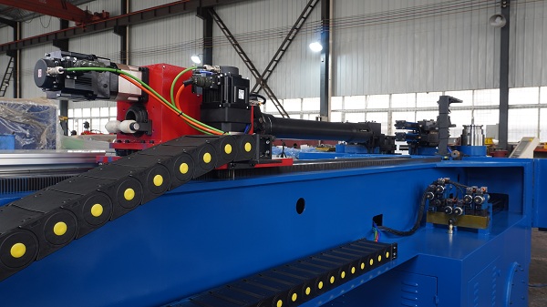 八、輔推油缸安裝在輔推架內(nèi)(頂鐓模塊的頂鐓油缸和頂鐓架為整體鍛造40Cr并調(diào)質(zhì)),輔推(頂鐓)油缸同等行程下有效減少輔推(頂鐓)機(jī)構(gòu)長度,避免了彎曲管件尾部因輔推(頂鐓)機(jī)構(gòu)長度帶來的直線段浪費(fèi)。(注:頂鐓功能模塊為特殊附件,需另訂)九、抓料、轉(zhuǎn)角、送料小車安裝在獨(dú)創(chuàng)的三道軌床身上(數(shù)控型,NC型無此項(xiàng)):